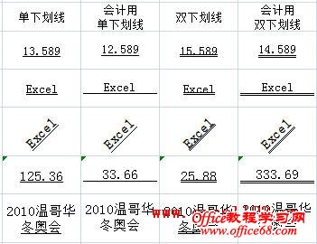 给Excel单元格中的内容设置下划线最快的方法是选择内容后单击工具栏中的“下划线”按钮或按快捷键Ctrl+U。但Excel还提供了多种不同的下划线样式,可以根据不同的需要进行设置。步骤如下: 1.选择需要设置的单元格或单元格内容。 2.鼠标右击,在弹出的右键菜单中选择“设置单元格格式”。 3.选择“字体”选项卡,单击“下划线”下的下拉列表,在其中选择一种下划线样式。 Excel提供了“单下划线”、“双下划线”、“会计用单下划线”和“会计用双下划线”几种下划线样式。其中“单下划线”与工具栏中的“下划线”命令相同。这几种下划线的显示效果见下图: 可以看到,会计用下划线与普通下划线有以下几点区别: ⑴会计用下划线的位置比普通下划线要低一些,或者说单元格内容要高一些,这样更便于看清数值。 ⑵对于文本或以文本显示的数值,会计用下划线会填充整个单元格。但对于设置为非水平方向的文本只会显示在文本的下部。 ⑶会计用下划线无法对单元格中的部分内容进行设置。 4.单击“确定”按钮 |