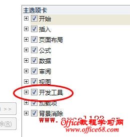 在Excel 2010中,要在功能区中显示“开发工具”选项卡,用下面的方法: 1.单击菜单“文件→选项”,弹出“Excel选项”对话框。 2.选择“自定义功能区”,在右侧的区域中勾选“开发工具”。 3.单击“确定”按钮 |