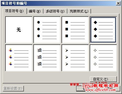 2.选择所有文本内容,在Word 2003中单击菜单“格式→项目符号和编号”,在弹出的对话框中选择“项目符号”选项卡,选择一种项目符号类型,单击“确定”。