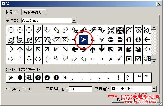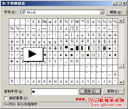 1.从“字符映射表”中复制所需的字符。在Windows XP中,单击“开始→运行”,打开“运行”对话框,输入“charmap”命令,单击“确定”。打开“字符映射表”对话框,选择一种字符,如“实心右指指针”,单击“选择”按钮。