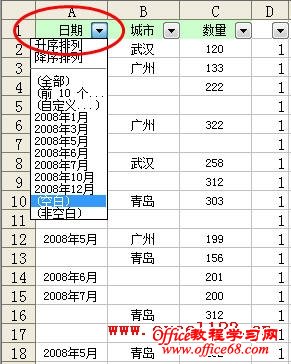 2.选择数据区域第一行(标题行)中的某个单元格,如B1单元格,在Excel 2003中单击菜单“数据→筛选→自动筛选”。如果数据区域没有标题行,可先添加后再进行自动筛选。