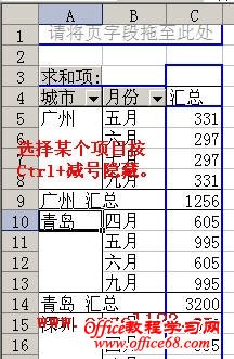 要隐藏Excel数据透视表中的某个项目,通常是进行筛选操作,即单击字段右侧的下拉箭头,然后在下拉列表中进行选择。如果只进行简单的筛选操作,如隐藏某个项目,用快捷键也十分方便。例如下图中,要隐藏某个“城市”的数据,只需在数据透视表中的“城市”字段中选择该城市,然后按快捷键“Ctrl+减号”即可。