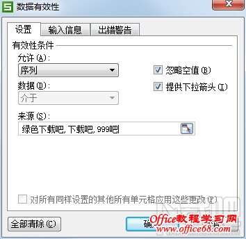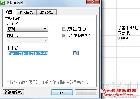 2、点击进入【有效性】,在设置选项卡中选择有效性条件为序列,勾选提供下拉箭头,来源输入你要的信息,如“绿色下载吧,下载吧,999吧”。