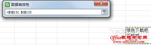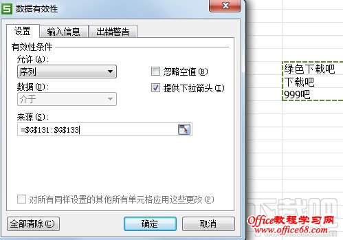 3、选中“绿色下载吧,下载吧,999吧”,在设置来源的时候还可以点击来运设置选择范围,如图:$G$131:$G$133。
