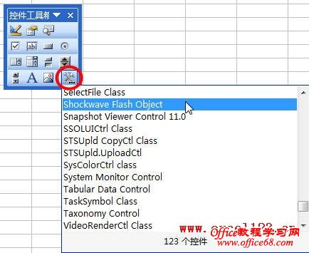 2.单击“控件工具箱”中的“其他控件”按钮,选择“Shockwave Flash Object”。