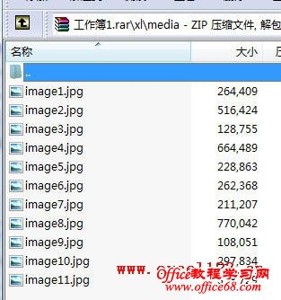 2.双击该文件用压缩软件如WinRAR打开。依次打开文件夹“xl→media”,在“media”文件夹中即可看到工作簿中的全部图片。