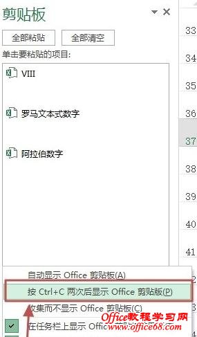 剪切板是临时存放数据的区域,我们复制的东西,先将内容放在剪切板中,需要使用时再将其粘贴到需要的位置。下面小编就教你怎么在Excel2013使用剪切板。 Excel2013使用剪切板的步骤: 启动Excel2013新建表格,如下图,发现没有显示剪切板界面。 ![]() 在“开始”选项卡,剪切板组中单击如下图所示的图标。 ![]() 打开剪切板,如下图所示。 ![]() 现在复制一下内容,可以复制不同的内容(并不定是Excel中的,其他任意位置都可以),这时候效果如下图所示。 ![]() 我们这时候可以借助剪切板,快速将不同的内容粘贴到指定的单元格。先将光标定位要需粘贴的单元格,然后在剪切板单击要粘贴的项目即可。 ![]() 选择启动方式:单击“选项”,然后选择需要的启动方式。 说明:自动显示Office剪切板,在该启动方式下启动Excel软件即可自动打开剪切板窗格。按Ctrl+C两次后显示Office剪切板,启动Excel软件后,按两次Ctrl+C即可启动剪切板窗格。 ![]() |