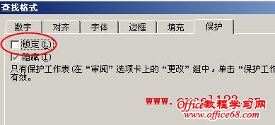 弹出“查找格式”对话框,选择“保护”选项卡。可以看到“锁定”复选框为灰色的半选状态,单击两次鼠标清除“锁定”复选框,单击“确定”。