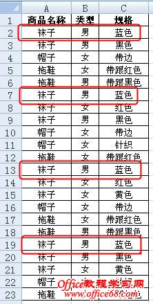 Excel2007/2010中的删除重复项功能不仅能删除单列中的重复值,还可以在连续的多列区域中删除重复行数据。有时会遇到这种情况,某列中的数据与同一行其他列的数据成对重复出现,例如在下图中“商品名称”为“袜子”与同一行中“规格”为“蓝色”的数据。