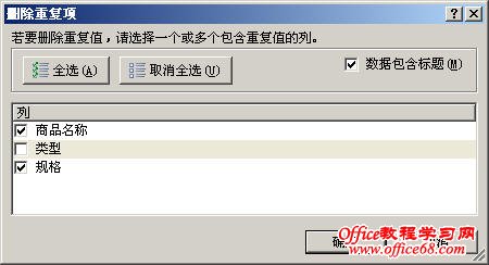 2.由于仅删除“商品名称”和“规格”两列中的对应重复行数据,因而在弹出的“删除重复项”对话框中,取消勾选不需要列标题,如本例中的“类型”。