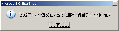 3.单击“确定”,Excel会在弹出的对话框中提示已删除的重复值数量和保留的唯一值数量。
