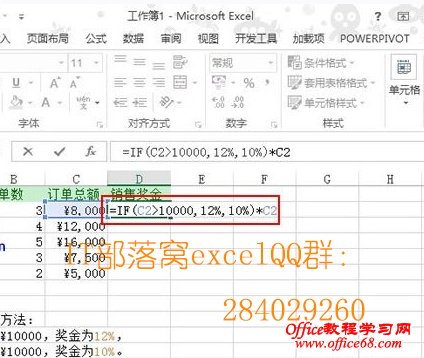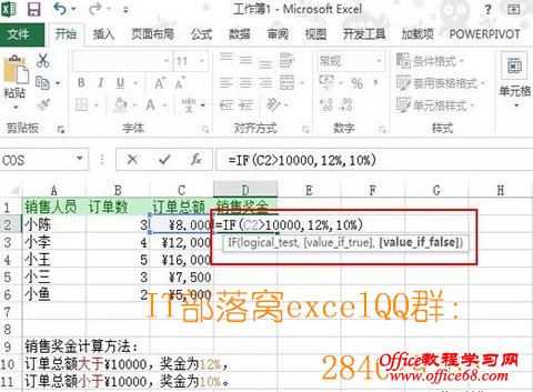 ![]() ②在D2单元格输入: =IF(C2>10000,12%,10%) ,判断条件是C2>10000,如果为真,则返回12%,否则是10%。当然公式并没有填写完全,这只是利率。