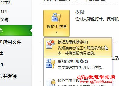 Excel工作簿编辑完成后,如果需要给其他用户查看,为避免他人无意间修改工作簿,在双方都使用Excel 2007或Excel 2010的情况下,可以将工作簿标记为最终状态,这样,其他用户在Excel 2007或Excel 2010中打开工作簿后,功能区中的编辑命令都不可使用,同时也不能在工作表中输入数据。设置方法如下 Excel 2007: 单击“Office按钮→准备→标记为最终状态”,Excel会弹出两次对话框,分别单击“确定”。 在Excel 2007中打开已标记为最终状态的工作簿后,在状态栏中会显示一个“标记为最终状态”的图标。 “标记为最终状态”并非一项安全功能,因为用户可以随时取消该标记并对工作簿进行编辑。要取消最终状态重新开始对工作簿进行编辑,单击“Office按钮→准备→标记为最终状态”即可。 Excel 2010: 单击“文件→信息→保护工作簿→标记为最终状态”,在两次弹出的对话框中单击“确定”。 在Excel 2010中打开已标记为最终状态的工作簿后,除了在状态栏中会显示一个“标记为最终状态”的图标,还会显示“标记为最终版本”的提示信息。单击“仍然编辑”按钮即可继续进行编辑。 如果关闭了该提示信息,再次单击“文件→信息→保护工作簿→标记为最终状态”也可启用编辑。 值得一提的是,由于Excel 2003没有“标记为最终状态”这一功能,因而在Excel 2003中打开在Excel 2007/2010中标记为最终状态的工作簿,该功能会失去意义 |