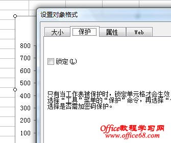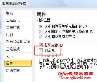 在Excel 2007中,右击其他图表的图表区,在弹出的快捷菜单中选择“设置图表区格式”,弹出“设置图表区格式”对话框;Excel 2010可直接双击图表区弹出“设置图表区格式”对话框。在对话框中选择“属性”,取消选择“锁定”。