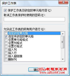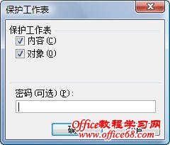 3.在Excel 2003中单击菜单“工具→保护→保护工作表”;Excel 2007和2010中在功能区中选择“审阅”选项卡,在“更改”组中单击“保护工作表”,弹出“保护工作表”对话框,在“允许此工作表的所有用户进行”下,可看到默认已选择“选定锁定的单元格”和“选定未锁定的单元格”两个选项,取消勾选“选定锁定的单元格”,根据需要输入密码、选择其他允许用户进行编辑的选项(“编辑对象”选项不能选择),然后单击“确定”。