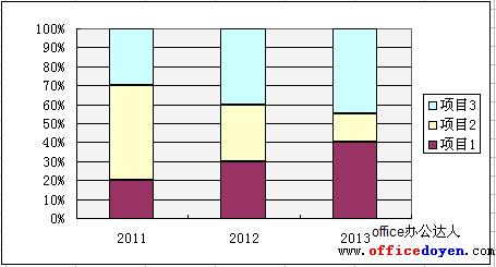 第一步:柱状图-百分比堆积柱状图,将B-E列制成百分比堆积柱状图:
