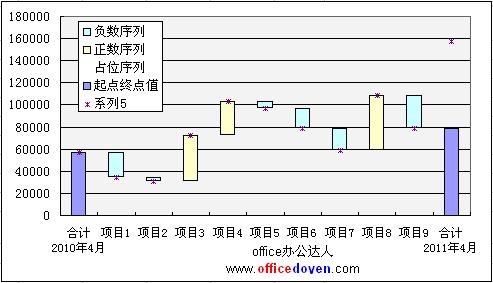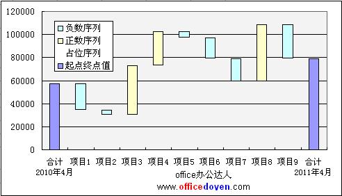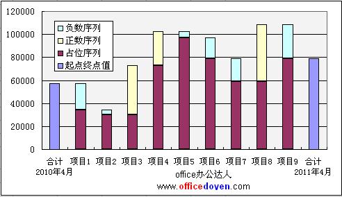 第三步:作图。用项目、起点终点值、占位序列、正数序列、负数序列的数据做堆积柱形图,将占位序列设置为无框无色,达到隐形,从而实现其他数据序列“悬浮”起来的效果。