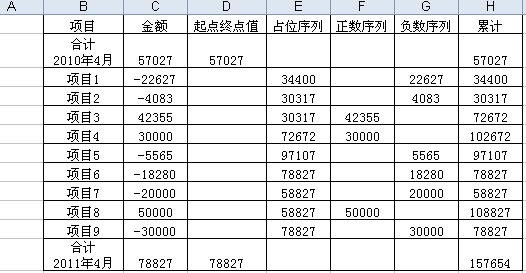 第二步:根据构图准备数据。准备的作图数据包括,起点终点值、占位序列、正数序列、负数序列、累计序列,每一序列数据都有它的用途。以第8行为例,公式如下: