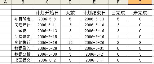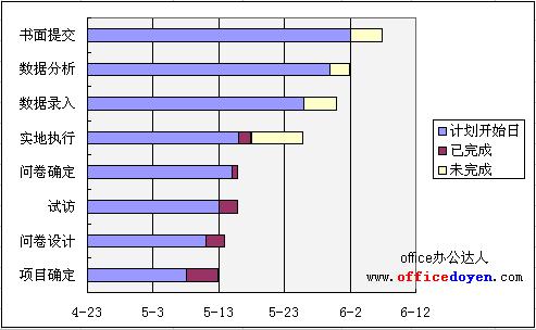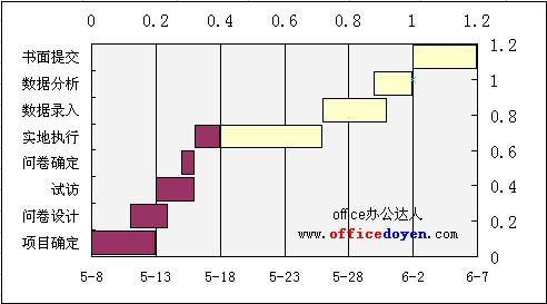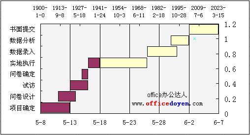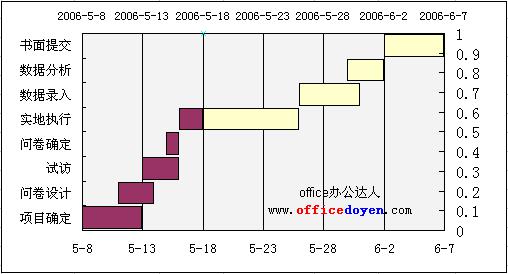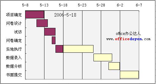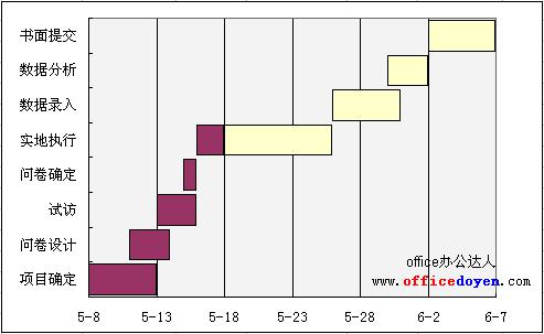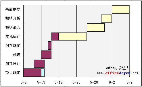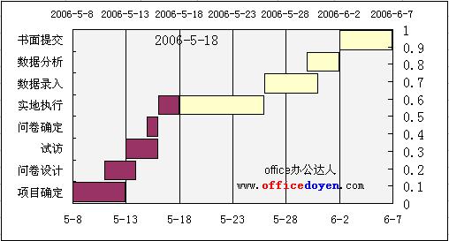 第一步:做序列B、C、F、G的条形堆积图(第一行也要) 第二步:先隐藏计划开始日,再根据单元格格式,计算出计划开始日2006-5-8的数值为38845,2006-6-7的数值为38875,对X轴刻度设置,最小值38845,最大值38875,最后通过数据系列格式-选项-分类间距设为10。 ![]() 第三步:点击图表-源数据-添加序列4-确定 第四步:设置序列4图表类型设为散点图 第五步:设置序列4散点图的X轴值为特定日期(如2006-5-18) ![]() 第六步:设置次数值Y轴最大值为1,次数值X轴的最小值38845,最大值38875。 ![]() 第七步:先设置散点-数据系列格式-误差线Y-自定义设为1,然后数据标志选择X值,最后设置图案标记为无。 ![]() 第八步:清除次数值Y轴,分类轴Y轴-分类次序反转 ![]() 第九步:对图表进行其他格式化,得到最终效果: ![]()
