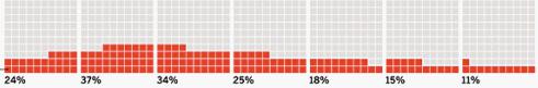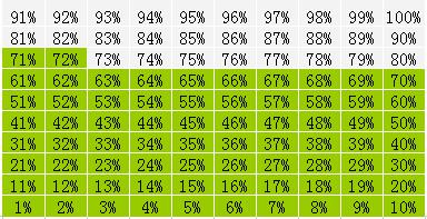如何制作如此动感的方块百分比?本文详细向你道来: 第一步:作图步骤:准备10*10的单元格矩阵区域。在C2:K11区域,从左到右、从下到上,输入1%-100%的数字。 第二步:设置条件格式。对这10*10个单元格,先全部填充灰色,然后对小于等于A1的设置条件格式为填充绿色。A1为待作图的百分比数值。不过,为了方便随手调整方块百分比图的颜色,我们反过来设置条件格式:即先对所有单元格都填充绿色,然后对大于A1的设置条件格式为填充灰色。这样,当想改变方块百分比图的颜色时,只需要调整10*10单元格区域的填充色就可以了,而不需要重新设置条件格式,操作上要方便些。 第三步:隐藏单元格数字。对C2:K11区域设置自定义格式为;;;,可以隐藏数字的显示。设置10*10个单元格区域的内外边框线为白色。然后调整列宽,使C2:K11区域为方块。至此,一个方块百分比图已经完成。 第四步:拍照导出方块百分比图。对C2:K11区域拍照,得到一个图片,可方便地调整大小至合适,然后引用到其他区域排版,如在旁边单元格加上大号字体的百分比标签显示。 ![]() |