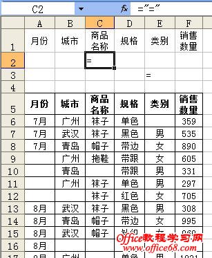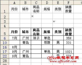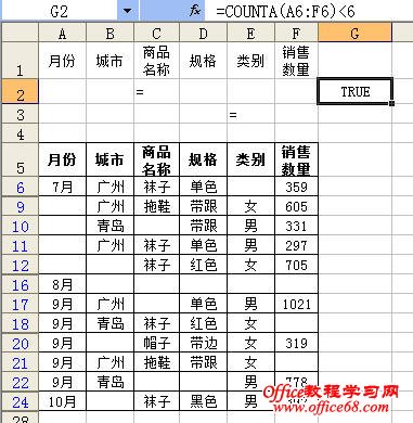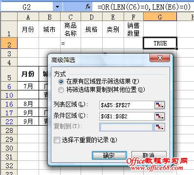要筛选出某列包含空单元格的记录,可以使用自动筛选:如在Excel 2003中单击筛选下拉箭头,选择“空白”即可。但当数据区域的多列中都包含空单元格,要同时筛选出这些包含空单元格的记录,自动筛选无法实现,这时可以用高级筛选。 一、同时筛选出两列中包含空单元格的记录 方法一:用两个筛选条件 在各列的筛选条件区域中输入下列公式: ="=" 然后进行高级筛选就可以筛选出列中包含空单元格的记录。例如下图的示例中,将筛选出“商品名称”或“类别”两列中包含空单元格的记录。 在Excel 2003中,选择数据区域,单击菜单“数据→筛选→高级筛选”,在弹出的对话框中输入条件所在区域:$C$1:$E$3: 单击“确定”就可以在原区域得到筛选后的结果。 方法二:使用一个筛选条件: 在某个单元格,如G2单元格中输入公式: =OR(LEN(C6)=0,LEN(E6)=0) 或: =OR(ISBLANK(C6),ISBLANK(E6)) C列和E列为“商品名称”列和“类别”列,第6行为数据区域中的第一行。由于使用公式结果作为条件进行高级筛选,因而需将条件标题保留为空,即保留G1单元格为空。同时需注意公式中第一行数据所在单元格(如C6、E6等)为相对引用。然后进行高级筛选,将条件区域设置为“$G$1:$G$2”。 二、同时筛选所有列中包含空单元格的记录 这时在G2单元格中输入公式: =COUNTA(A6:F6)<6 说明:A6:F6为数据区域中包含数据的第一行。由于本例中的数据区域有6列,用COUNTA函数统计非空单元格个数小于6个(即至少包含一个空单元格)的记录。 也可用下面的公式: =COUNTBLANK(A6:F6)>0 保留G1单元格为空,然后按照上述方法进行高级筛选。 |