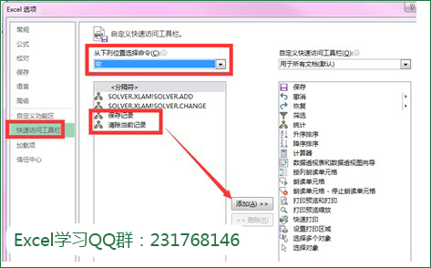 1. 点下自定义快速访问工具栏的小三角,选择【其他命令】-【快速访问工具栏】-从下列位置选择命令下拉框中-选择【宏】,将这二个宏【保存记录】与【清除当前记录】添加到右边,操作步骤如下: