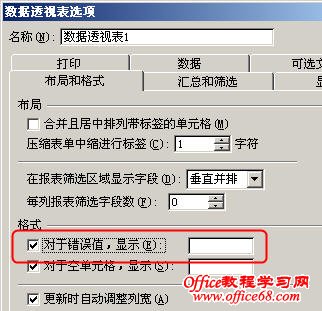 在Excel数据透视表中,由于某种原因有时会出现错误值。如果不希望错误值出现在数据透视表中,可以用下面的方法将其隐藏起来。 Excel 2007/2010中的设置方法是:右击数据透视表,在弹出的快捷菜单中选择“数据透视表选项”,弹出“数据透视表选项”对话框,在“布局和格式”选项卡中勾选“对于错误值,显示”选项,单击“确定”。这样对于数据透视表数据区域中的错误值都会显示为空。在Excel 2003中可用类似的方法进行设置。 |