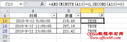 然后向下拖动或双击填充柄填充公式。对于整点的时间公式返回TRUE。