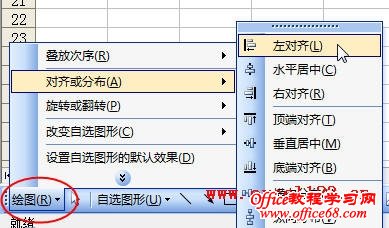 2.在“绘图”工具栏中单击“绘图→对齐或分布→左对齐”。如果“绘图”工具栏没有显示,可以单击菜单“视图→工具栏→绘图”让其显示出来。
