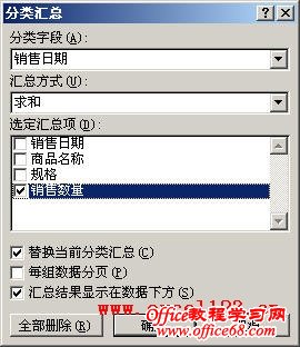 选择数据区域中的某个单元格,在Excel 2003中单击“数据→分类汇总”;在Excel 2007/2010中选择“数据”选项卡,在“分级显示”组中单击“分类汇总”按钮,弹出“分类汇总”对话框,在“分类字段”下选择“销售日期”,在“汇总方式”下选择“求和”,在“选定汇总项”下选择“销售数量”。单击“确定”。
