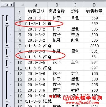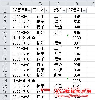 利用Excel中的分类汇总功能可以方便地汇总同类数据,十分实用。但有时可能需要仅对数据区域中的部分记录行进行分类汇总,例如在下图所示的数据中,部分“销售日期”所对应的记录只有一条,如“2011-3-1”和“2011-3-3”等,直接分类汇总后这些记录的后面也会包含一个汇总行。