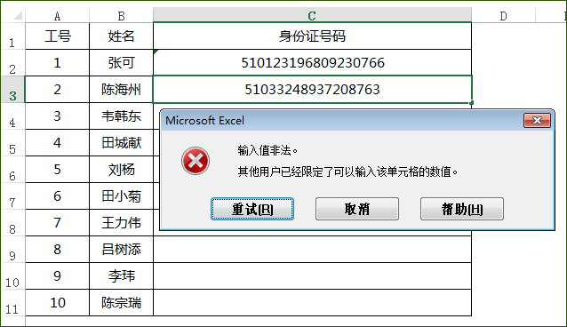 上面的提示框,其实是数据有效性出错警告。原因就是为了确保数据录入的规范性,在C列做了数据有效性设置,确保录入的数字都是18位数字,否则就会报错。