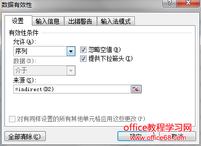 3、选择“城市”一列,在“数据有效性”中选择“序列”,并在“来源”处输入公式:=INDIRECT(D2),点击“确定”。