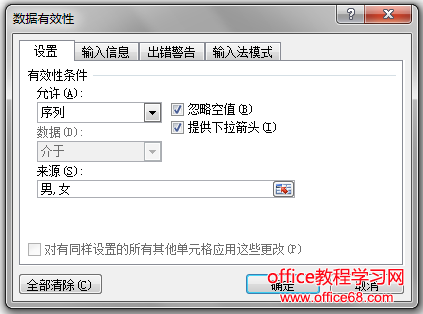 1、单击【数据】选项卡中的【数据有效性】,在“数据有效性”对话框的“设置”选项卡中,在“允许”下拉列表框中选择“序列”项。在“来源”框中直接输入项目,项目之间用英文逗号分隔。