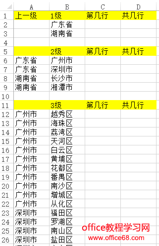 我们除了会填写“省份”、“城市”外,还会选择“区”,那这种我们称为多级下拉列表。我们可以利用Vlookup、Offset、match、countif函数共同实现该功能。