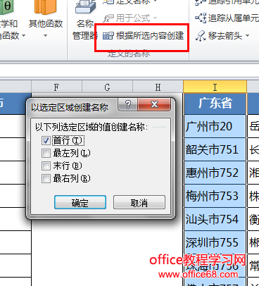 制作二级下拉菜单时,首先需要为各个省份的城市分别定义名称,之后才能根据省份读取到相应的城市。定义名称时,先选中广东省下所有城市(I1:I22),在【公式】选项卡下点击“根据所选内容创建”,然后勾选“首行”并点击“确定”,完成“广东省”的名称定义。以同样的方法,定义名称“湖南省”和“湖北省”。