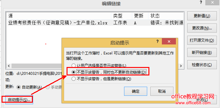 有一个方法防止弹出对话框,在【编辑链接】中选择【启动提示】,然后选择“不显示该警告,同时也不更新自动链接”。从此就再没有更新对话框的提醒了,世界瞬间清静了。