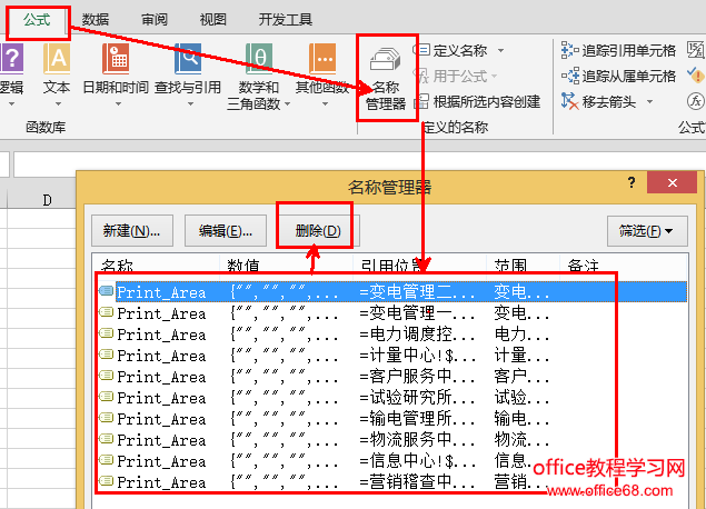 单击【公式】-【名称管理器】,选中名称后,单击【删除】即可。