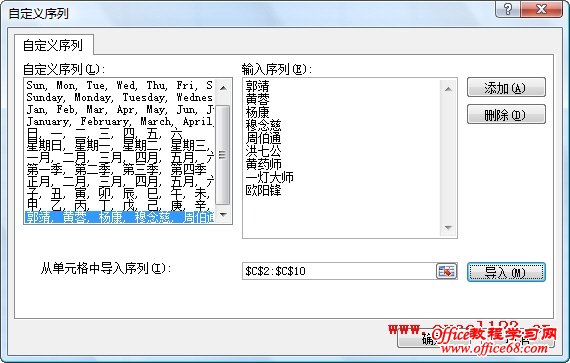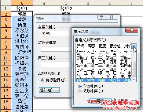 问题:Excel工作表的A列和C列中有两列名单,C列的姓名都来自于A列,但这两列的排序顺序不同,怎样才能将这两列名单的排序顺序变成一致,使其一一对应? 用自定义排序的方法可以实现,步骤如下: 1.添加自定义序列。 选择C2:C10,然后进行下拉操作: Excel 2003:单击菜单“工具→选项→自定义序列”。 Excel 2007:单击“Office按钮→Excel选项→常规”,单击“编辑自定义列表”。 Excel 2010:单击“文件→选项→高级”,在“常规”下单击“编辑自定义列表”。 然后单击“导入”按钮,将C列名单添加到自定义序列。 2. 用自定义序列排序。 先选择A列中的名单,本例为A2:A98,然后进行自定义排序。 Excel 2003:单击“数据→排序→选项”,然后在“自定义排序次序”下选择新添加的自定义序列,单击两次确定即可。 Excel 2007/2010:在功能区中单击“数据”选项卡,在“排序和筛选”组中单击“排序”按钮。在“排序”对话框的“次序”下选择“自定义”,再选择新添加的自定义序列,最后单击两次确定 |