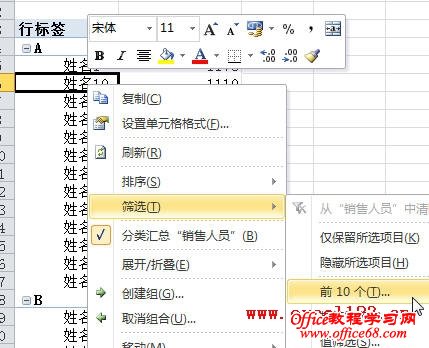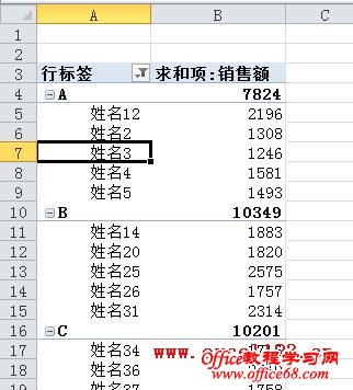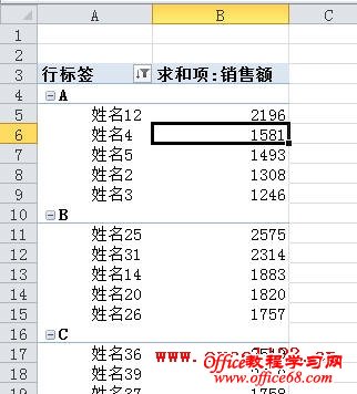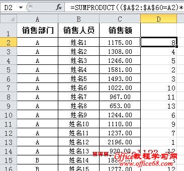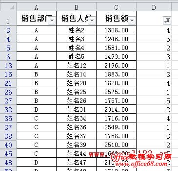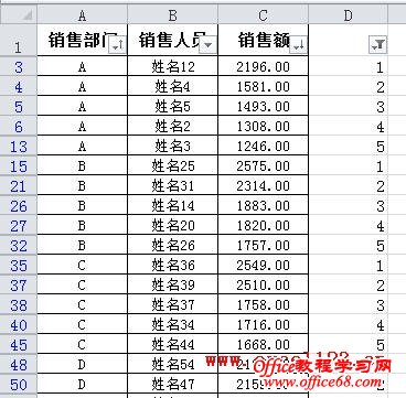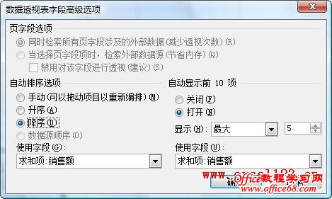 通常在Excel中筛选数据时是针对某列进行的,有时需要在筛选时同时考虑其他列,如按类别进行筛选。例如在下图所示的表格中,A列列出了各销售部门,C列为各销售人员的销售额,现在需要筛选出各“销售部门”前5名的销售人员。 假如数据在A2:C60区域中,以Excel 2010为例,方法如下: 方法一:辅助列+公式 1.以D列为辅助列,在D2单元格中输入公式: =SUMPRODUCT(($A$2:$A$60=A2)*($C$2:$C$60>C2))+1 然后向下填充公式至D60单元格,会返回D列各部门销售人员的销售额排名。 2.对D列进行自定义筛选。 选择D2单元格,在“数据”选项卡的“排序和筛选”组中单击“筛选”。单击D2单元格出现的筛选箭头,选择“数字筛选→小于或等于”,在弹出的对话框中“小于或等于”右侧的文本框中输入“5”后确定。 Excel即可筛选出各部门销售额排名前5位的数据。 3.上图中虽列出前5位数据,但没有按销售额从高到低排列。要得到这样的结果,只需以A、D列为主要和次要关键字进行排序即可。方法是: 选择数据区域的某个单元格,在“排序和筛选”组中单击“排序”按钮,弹出“排序”对话框,在“主要关键字”后的下拉列表中选择“销售部门”,单击“添加条件”按钮,增加第二个排序条件,将“次要关键字”设置为“销售额”,“次序”设置为“降序”,单击“确定”。 最终的筛选、排序结果如下图。 方法二:使用数据透视表 1. 选择数据区域中的某个单元格,单击“插入”选项卡中的“表格”组中单击“数据透视表→数据透视表”,在弹出的对话框中单击“确定”创建数据透视表。 2.在“数据透视表字段列表”中将三个字段全部选中,Excel会自动将“销售部门”、“销售人员”字段放入行标签区域,将“销售额”放入数值区域。如果是Excel 2003,则分别将三个字段拖入到相应的区域。 3.右击数据透视表中的某个销售人员姓名,在弹出的右键菜单中选择“筛选→前10个”。 4.弹出“前10个筛选”对话框,将默认的数字“10”改为“5”。 单击“确定”,Excel将筛选出各“销售部门”销售额前5名的销售人员。 5.按销售额从高到低排序:选择某个销售额,在“数据”选项卡的“排序和筛选”组中单击“Z→A”按钮即可。如果不需要分类汇总,可选择数据透视表后,在“数据透视表工具-选项”选项卡的“布局”组中单击“分类汇总→不显示分类汇总”。 如果是Excel 2003,从上述第3步开始可进行如下设置:右击数据透视表中的某个销售人员姓名后选择“字段设置”,弹出“数据透视表字段”对话框,单击“高级”按钮。 在“数据透视表高级选项”对话框中的“自动排序选项”下,选择“降序”,在“自动显示前10项”下选择“打开”,将数字“10”改为“5”。 单击两次“确定”后得到最终的分类筛选结果。 要取消分类汇总,在上述“数据透视表字段”对话框中,将“分类汇总”设置为“无”即可 |