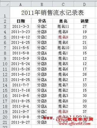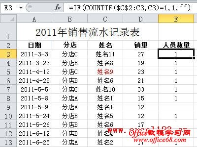如果Excel表格中某列数据包含重复的项目,要统计该列唯一值的出现数量,即对于重复出现的数据只计算一次,除了使用公式,在某些情况下还可以使用数据透视表。如下图为某产品的销售流水记录表,可以看到其中“分店C”中的员工“姓名9”有四条记录,现在需要用数据透视表来统计表中各分店员工的数量,即对于类似“姓名9”的重复姓名在各分店中只计一次。 Excel并没有提供直接的函数或命令在数据透视表中得到唯一值的总数,本文介绍在数据源中添加辅助列的方法,以上图为例,假如数据在A2:D21区域中,且记录会不断增加,在Excel 2010中步骤如下: 1.添加辅助列。以E列为辅助列,在E2中输入一个标题,如“人员数量”,在E3中输入公式: =IF(COUNTIF($C$2:C3,C3)=1,1,"") 然后向下填充公式至最后一条记录所在行。 2.插入名称。该名称将作为数据透视表的数据源,以便在添加新的记录后可通过刷新数据透视表来更新数据。 在“公式”选项卡中单击“定义名称”按钮,在弹出的对话框的“名称”右侧输入一个名称,如“数据源”,在“引用位置”后输入下列公式: =OFFSET($A$2,,,COUNTA($A$2:$A$1000),5) 单击“确定”添加该名称。 3.插入数据透视表。选择数据区域中的某个单元格,在“插入”选项卡中单击“数据透视表→数据透视表”,弹出“创建数据透视表”对话框,在“表/区域”右侧的文本框中输入上述定义的名称“数据源”,单击“确定”。 将“分店”和“人员数量”字段分别拖入“行标签”和“数值”区域,默认“人员数量”字段的值汇总方式为“计数”,表示数据源中各分店中包含重复项的记录数,如图。 将该字段的值汇总方式为“求和”后即可得到各分店唯一值的数量,方法是右击数据透视表中“人员数量”列中的某个数字,在弹出的快捷菜单中选择“值字段设置”,然后在“值汇总方式”选项卡中选择“求和”后确定。 这时即可得到所需的结果。 以后如果增加了新的记录,只需在“数据透视表工具-选项”选项卡中单击“刷新”或按快捷键“Alt+F5”刷新数据透视表即可 |