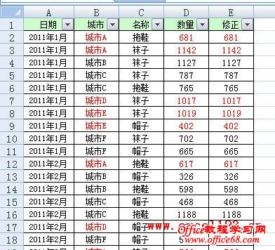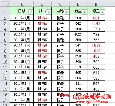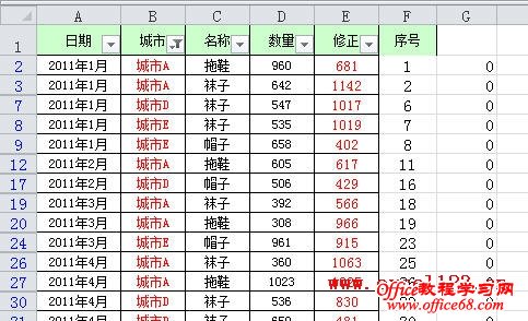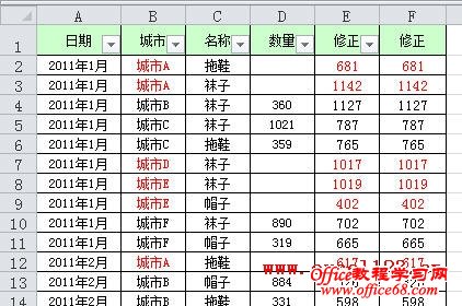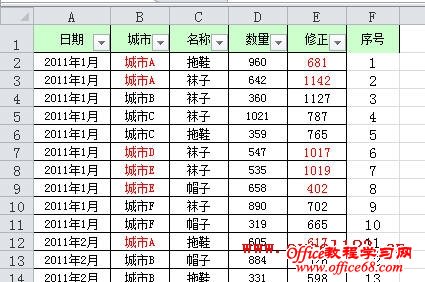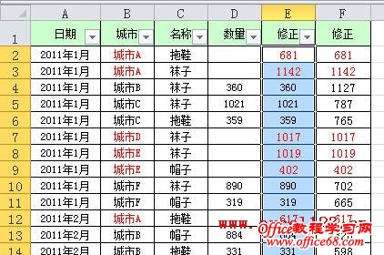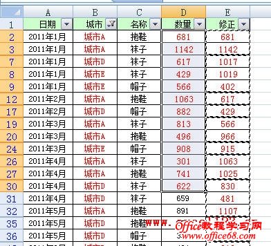 在Excel中对某区域数据进行筛选后,有时需要将筛选区域中的一列数据用另一列进行替换。例如在下图中,要将某些城市对应D列的“数量”用E列的“修正”数据进行替换,为方便查看,E列需替换的数据已用红色进行标识。本例中,由于E列还包含了其他数据,因而不能在筛选前直接进行复制粘贴,另外,由于需替换的“城市”较多,直接对“城市”进行排序后逐一复制粘贴显得有些繁琐。对于这种情况,可以用下面的几种方法较为快捷。 方法一:筛选后直接复制粘贴 这种方法仅适用于Excel 2003和Excel 2007。方法是先对B列进行筛选,然后复制E列数据,选择D列第二行的单元格(本例为D2)进行粘贴,第一次粘贴时,数据并不是粘贴到了D列所有可见单元格,而是仅粘贴到部分可见单元格,如图为Excel 2007中的结果。 这时按Ctrl+Z,或点“撤消”按钮,再次选择D2单元格进行粘贴,就会将复制的内容粘贴到D列所有可见单元格。可以看到,取消筛选后,仅对D列所筛选的单元格进行了替换。 这种方法比较直接,甚至有点奇异,但在Excel 2003和Excel 2007中是确实可行的,遗憾的是该方法不适用于Excel 2010。 方法二:公式法 先对B列进行筛选,然后在D列第二行的单元格(本例为D2)中输入公式: =E2 然后双击或拖动填充柄将公式填充到D列筛选后的所有可见单元格。取消筛选后,可以看到仅对D列所筛选的单元格进行了填充。但这时所填充的内容为公式,如果要转换为数值,可先取消筛选,再复制D列数据后选择性粘贴为值。 方法三:选择性粘贴跳过空单元 1.如果需要保留E列数据,可先将E列数据复制到F列,否则跳过这一步。 2.筛选B列,然后选择筛选后的D列数据,按Del键删除。 3.取消筛选,这时数据如下图。 4.复制D列数据,然后右击E2单元格→选择性粘贴,在弹出的对话框中勾选“跳过空单元”后确定。 这时D列所有非空单元格的数据将复制粘贴到E列对应单元格,而空单元格会被忽略。 5.将E列标题改为D列的标题,删除D列。 方法四:排序后复制粘贴 1.如果原区域中包含类似“序号”的列,可忽略此步,否则在F列增加一个辅助列“序号”,并用序列数填充。增加该列的目的是为以后可以还原原有的排序顺序。 2.筛选B列数据,然后再次增加一个辅助列。本例增加G列为第二个辅助列,并将该列筛选后的可见单元格全部填充某个数值或字母等,如本例全部用数字“0”填充。 3.取消筛选,将G列按升序排序,让G列所有非空单元格所在的行排列到上方,这时所需替换的数据就排列到一起了。 4.选择E列需要替换的数据复制粘贴到D列对应的单元格 。 5.将“序号”列按升序排序,然后删除F、G列即可 |