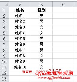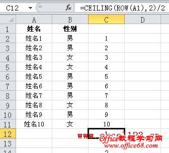 1.以C列为辅助列,在C2、C3分别输入数字“1”、“2”,然后选择这两个单元格,双击填充柄填充序列到C11单元格。