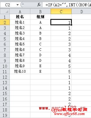 然后拖动填充柄填向下充公式,直到公式返回结果的最大值大于B列“组别”的数量(C11单元格),本例为5。