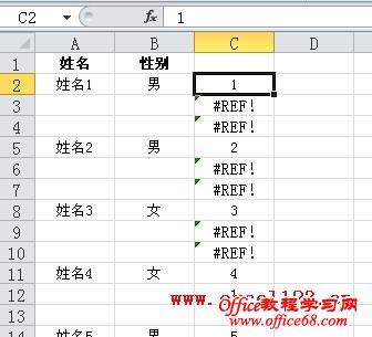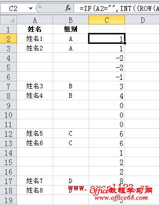 这两个公式的作用是在C列产生类似“1、1、2、2……10、10”的序列,以便排序后将空行排列到各“姓名”行的下方。如果要插入N行,将公式中用红色标识的数字“2”替换成N即可。