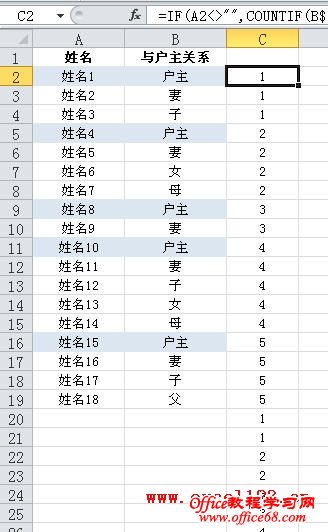 =IF(A2<>"",COUNTIF(B$2:B2,"户主"),INT((ROW(A1)-COUNTA(A:A))/2)+1)