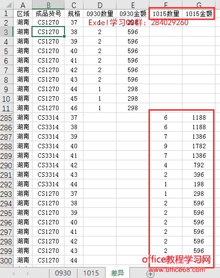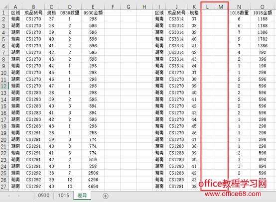 3、拖选第2张表“1015”中的A~E列,并复制,粘到差异表I列(与第1组数据空数据项数+1=3列),并将“数量”改为“1015数量”、“金额”改为“10150金额”: