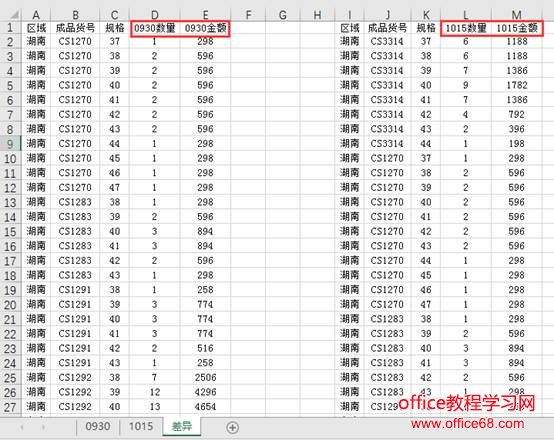 2、将“差异表”中的“数量”改为“0930数量”、“金额”改为“0930金额”。