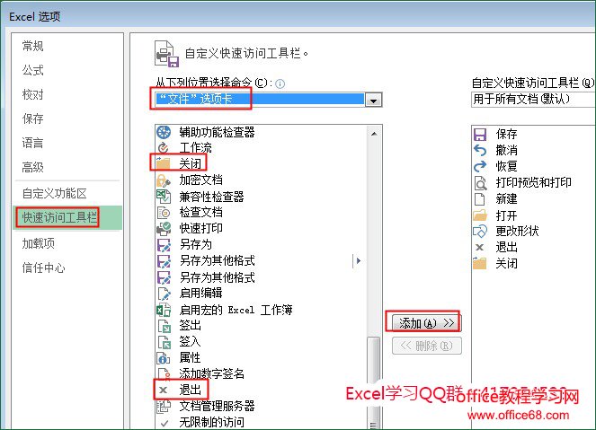 ![]() 具体操作步骤:执行“文件——选项”,打开“Excel选项”,参考下面的截图将“关闭”和“退出”添加到快速访问工具栏。后续只需要单击相应的按钮,就可以关闭和退出。