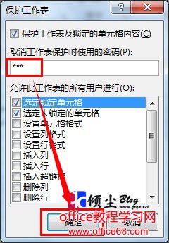 2、此时将打开“保护工作表”对话框,在对话框的“取消工作表保护时使用的密码”框中输入保护密码,在“允许此工作表的所有用户进行”列表中勾选相应复选框选中需要保护的项。在“保护工作表”对话框中没有被勾选的操作,在受保护工作表中将无法进行。